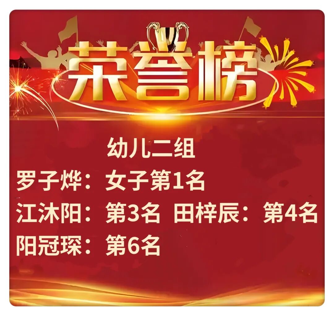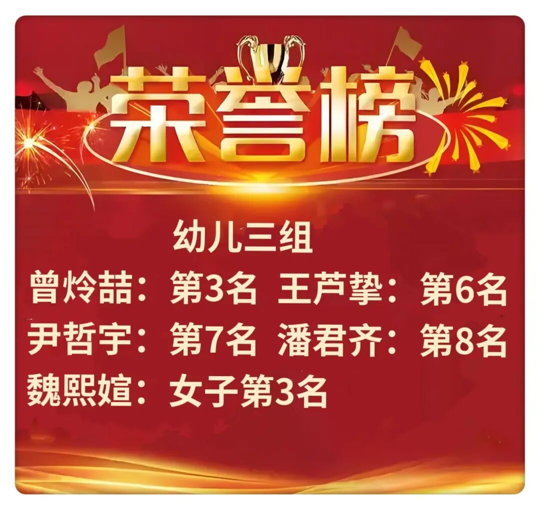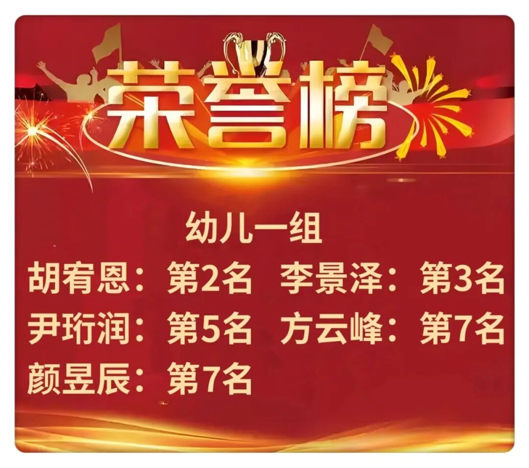 经过 激烈角逐 获团体前三名的幼儿园队是: 第一名 :青青奇星艺术幼儿园 第二名: 宋妈妈保蓝幼儿园 并列第三名 :青山区第二幼儿园 青青芳草幼儿园 各组男子、女子个人冠军 : 赵博远. 姚姝杨 . 周开朗.罗子烨. 郑以诺.肖舒文 武汉启智围棋 学校 武汉启智围棋学校的幼儿在本次比赛也表现不俗,不仅获得了团体冠军,也获得了许多个人好名次。 罗子烨: 女子第一名金牌 胡宥恩: 银牌 李景泽 :铜牌 曾炩喆:铜牌 江沐阳 :铜牌 魏熙媗:铜牌 围棋是培养耐心和策略的游戏,孩子的热爱和信心比胜负更重要。 此次围棋比赛,每个小棋手都收获满满,乐在“棋”中!无论胜负,他们都能保持良好的心态,胜不骄、败不馁。对弈中,他们学会了专注思考,培养了耐心和毅力。不仅展现出了高超的棋艺,也让他们感受到了围棋这一传统文化的魅力,在围棋世界里收获成长与快乐、书写属于自己的精彩!